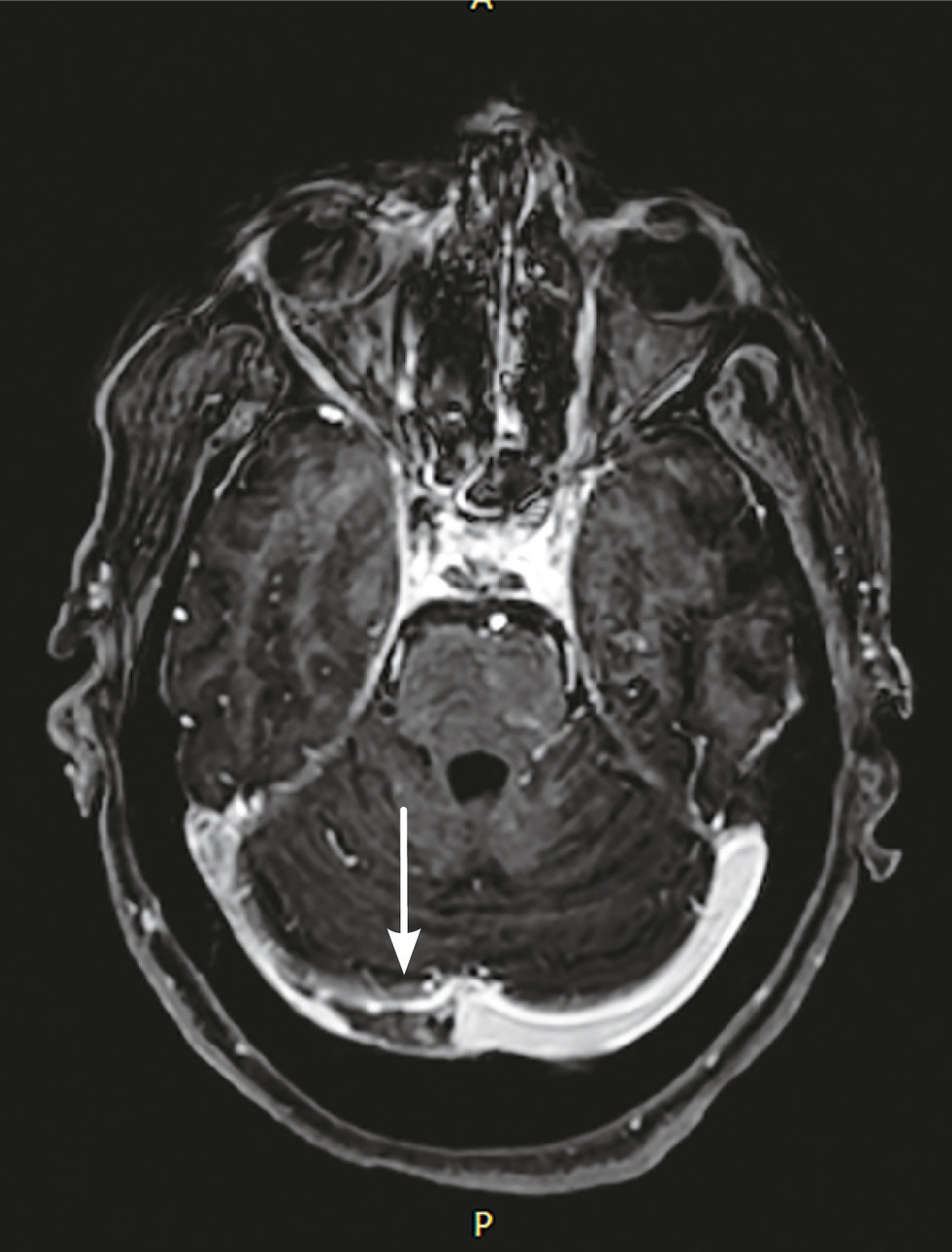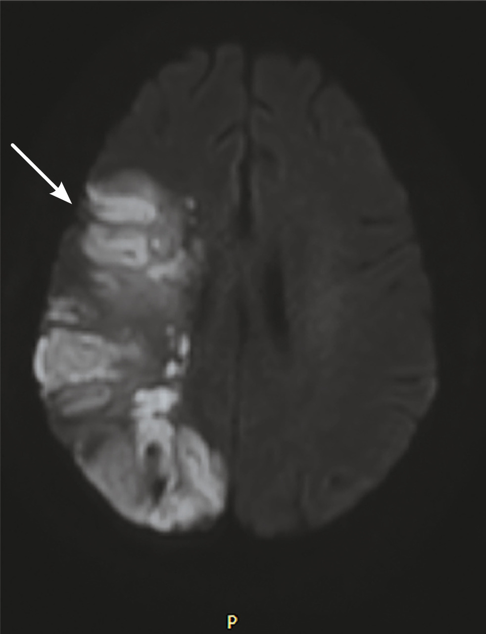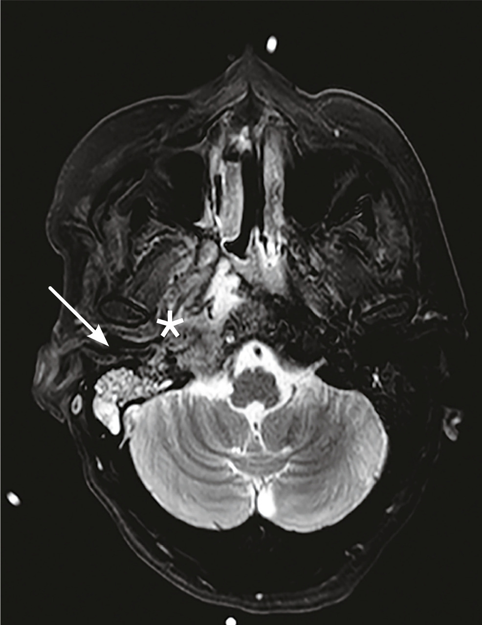 Cette femme de 45 ans était admise aux urgences à la suite d’une hémiplégie gauche. Une imagerie par résonance magnétique (IRM) cérébrale montrait un accident vasculaire cérébral ischémique aigu du territoire de l’artère cérébrale moyenne droite (fig. 1 ) avec occlusion de l’artère carotide droite. Par ailleurs, il y avait un comblant otomastoïdien droit (fig. 2 ) avec collection abcédée parapharyngée homolatérale (fig. 2 ) et thrombose de la veine jugulaire interne droite étendue au sinus sigmoïdien et latéral (fig. 3 ). Après 21 jours d’antibiothérapie intraveineuse combinée à l’anticoagulation, l’IRM de contrôle montrait une recanalisation de la carotide interne et de la veine jugulaire interne.