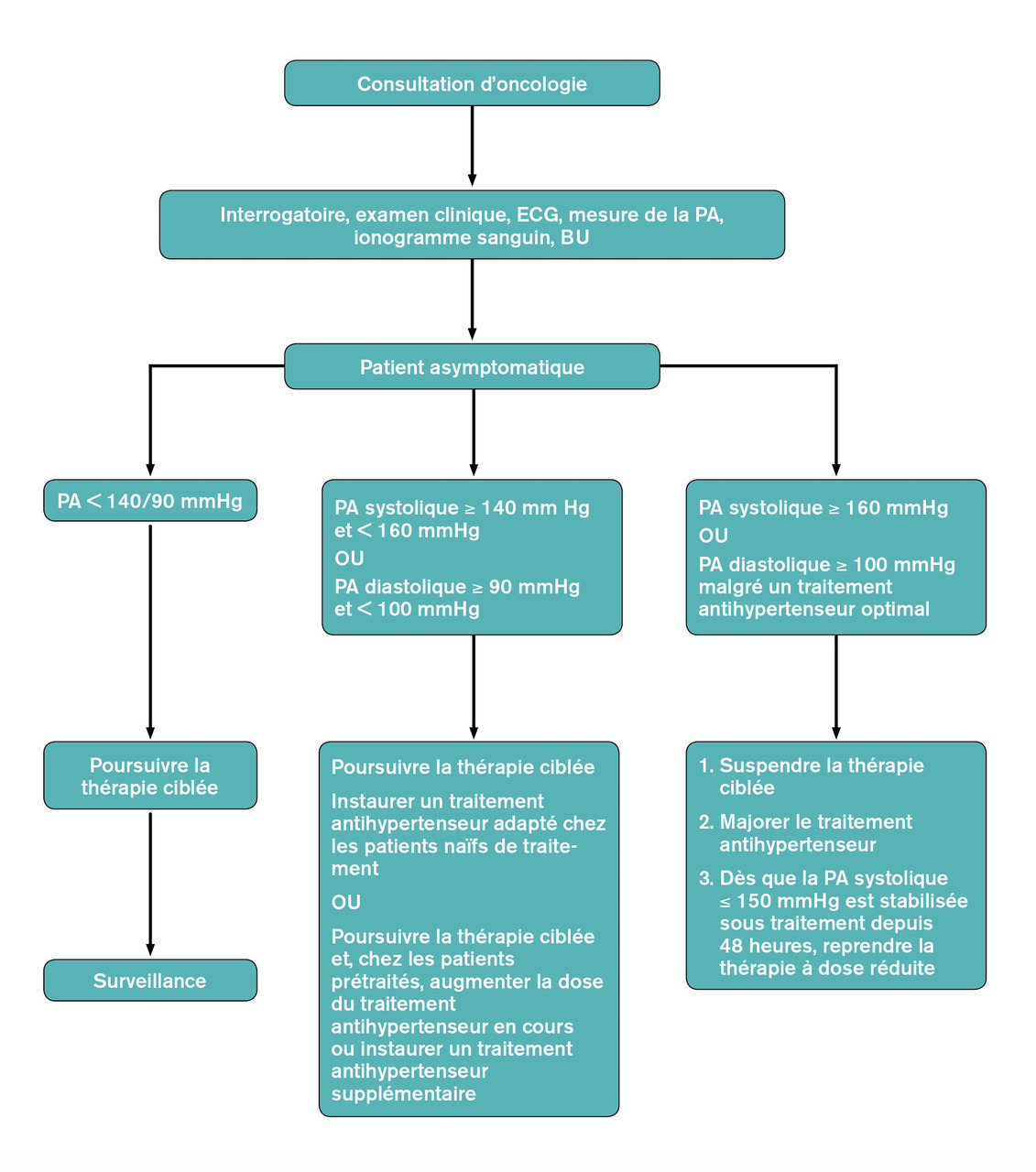 La thérapie ciblée peut être débutée sans évaluation supplémentaire, et notamment sans avis cardiologique préalable, si le patient est asymptomatique sur le plan cardiologique, que la pression artérielle mesurée est normale ou contrôlée sous traitement antihypertenseur, et qu’il n’existe pas d’atteinte rénale définie par un débit de filtration glomérulaire (DFG) inférieur à 30 mL/min/1,73m² et par une protéinurie des 24 heures >0,3 g/j. Les patients devront être suivis de manière régulière lors des consultations d’oncologie et éventuellement être dirigés vers un cardio-oncologue en cas d’hypertension de novo, d’une déstabilisation d’une hypertension déjà connue ou en cas d’apparition de symptômes.