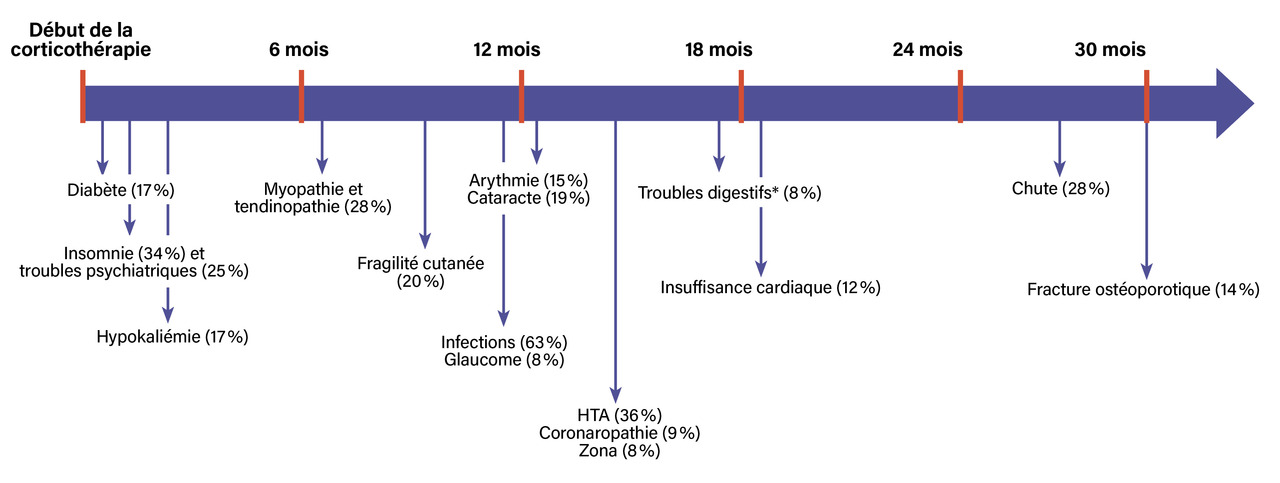 Avec ce traitement, tous les patients entrent en rémission, mais les rechutes sont fréquentes lors de la décroissance des doses. En effet, 47 % des patients rechutent à l’occasion de la décroissance des corticoïdes, généralement à des doses inférieures à 10 mg/j d’équivalent prednisone.2 Ces rechutes sont habituellement mineures, se limitant à des céphalées et/ou des signes de pseudopolyarthrite rhizomélique (PPR) accompagnés d’un syndrome inflammatoire. Il est très rare qu’elles soient sévères, et exceptionnel qu’elles occasionnent des complications ophtalmologiques (moins de 1 % des cas). Cependant, ces rechutes contribuent à prolonger la durée de la corticothérapie, et donc la dose cumulée, ce qui conduit à la survenue d’effets indésirables de la corticothérapie, dont la fréquence est estimée à plus de 80 % dans cette population.3,4 Les principaux effets indésirables de la corticothérapie, leur délai de survenue et leur fréquence sont présentés dans la figure .5