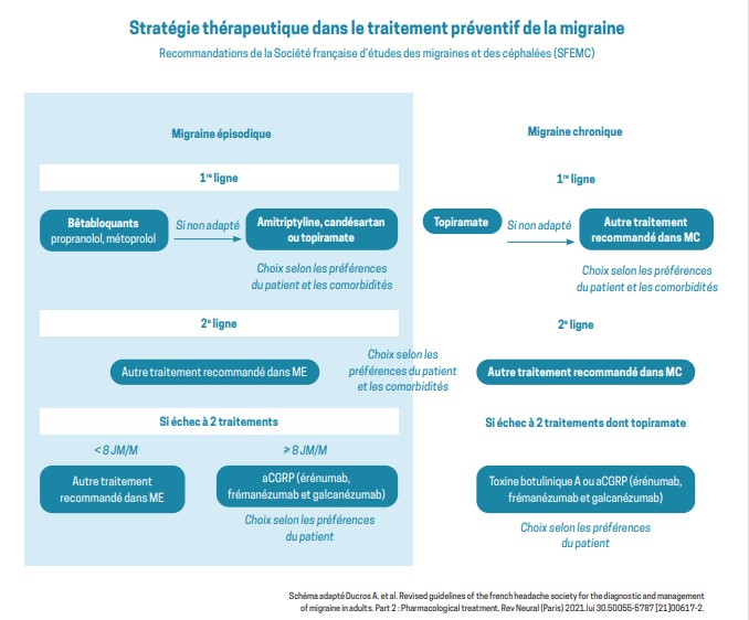 Ducros A, de Gaalon S, Roos C. Revised guidelines of the French headache society for the diagnosis and management of migraine in adults. Part 2: Pharmacological treatment. Rev Neurol (Paris) 2021;177(7):734-52.