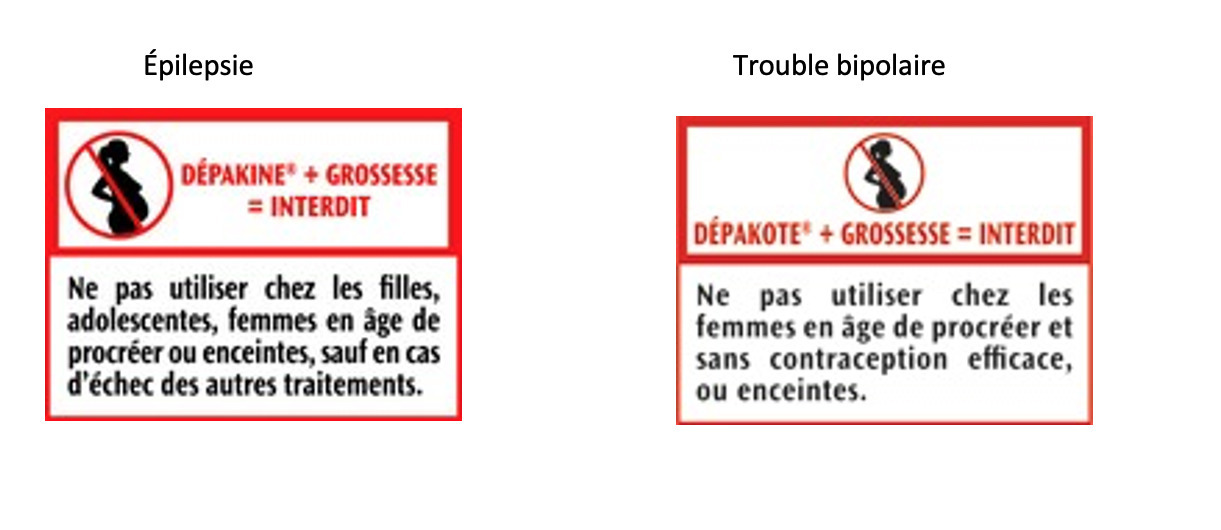 La tératogénicité du valproate est connue depuis les années 1980, mais plus de 1 000 grossesses étaient encore exposées à ce médicament chaque année jusqu’en 2013. Des alertes ont été lancées depuis 2015 limitant chez les femmes épileptiques successivement les initiations de prescription (juin 2015) puis leur renouvellement (31 décembre 2015), et chez les femmes bipolaires les initiations de prescription et le renouvellement (juillet 2018). La recommandation officielle est « Ne pas prescrire de valproate chez les filles, les adolescentes, les femmes en âge de procréer et les femmes enceintes, sauf en cas d’inefficacité ou d’intolérance aux alternatives médicamenteuses ». Et, depuis 2017, un pictogramme figure sur chaque boîte avec la mention « VALPROATE + GROSSESSE = INTERDIT. Ne pas utiliser chez les femmes en âge de procréer et sans contraception efficace, ou enceintes » (fig. 1).