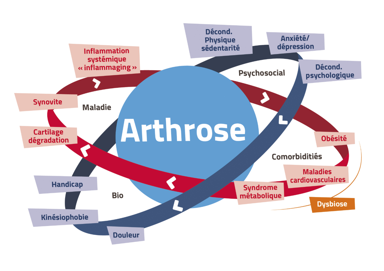 L’arthrose est la plus courante des affections musculo-squelettiques. Sa prévalence clinique augmente progressivement avec l’âge, mais de façon plus importante après 45 ans. Elle est généralement caractérisée par des signes et symptômes facilement identifiables à l’examen clinique : douleur aux mouvements, déformation des extrémités osseuses, gonflement, craquements et limitation de l’amplitude articulaire. La douleur est un élément déterminant dans l’évolution de la maladie. Elle est souvent déclenchée ou accentuée par le mouvement, ce qui peut induire chez le patient arthrosique une kinésiophobie et un comportement d’évitement, tous deux causes de sédentarité et de déconditionnement physique. Ces comportements délétères peuvent à leur tour entraîner de l’anxiété, de la dépression, voire un déconditionnement psychologique et social. Ces facteurs sont autant d’amplificateurs de la douleur chronique qui peuvent plonger le patient dans un cercle vicieux biopsychosocial (v. infra ). Cependant, le modèle biopsychosocial ne suffit pas, à lui seul, à expliquer l’ensemble des phénotypes de la maladie. Récemment, une relation entre le syndrome métabolique et l’arthrose a été démontrée. En effet, le syndrome métabolique dans son ensemble ou ses déterminants pris individuellement (hypertension artérielle, hypercholestérolémie, hyperglycémie et obésité) sont des facteurs de risque de l’incidence et de la progression radiologique de la gonarthrose. Cette relation entre arthrose et syndrome métabolique est à double sens, puisque l’arthrose est une cause de sédentarité, elle-même facteur de risque du syndrome métabolique.2 Cette « découverte » a donné une dimension systémique à la maladie. De plus, l’arthrose contribue à l’inflammation systémique, à bas bruit, associée au vieillissement. Ce phénomène, appelé inflammaging par les Anglo-Saxons, a été identifié comme facteur pathogénique de l’athérosclérose et donc des maladies cardiovasculaires (v. figure ).4, 5 Enfin, la dysbiose (déséquilibre du microbiote intestinal) et l’augmentation de la perméabilité intestinale pourraient favoriser le passage dans le sang de bactéries commensales et de facteurs inflammatoires ensuite véhiculés jusqu’aux articulations.6 Ces découvertes majeures sur la physiopathologie de la maladie ouvrent de nouvelles perspectives de traitement de l’arthrose. Elles justifient une approche holistique du patient inté-grant non seulement le problème articulaire mais aussi les comorbidités et les répercussions psychosociales de la maladie.