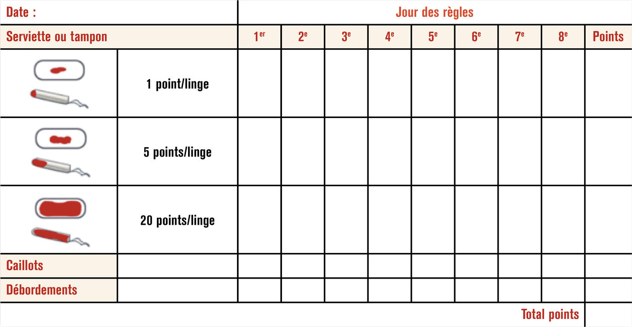 Établir un calendrier menstruel (fig. 2) : âge et caractéristiques des premières règles (ménorragies inaugurales : suspicion de maladie de Willebrand), longueur et régularité des cycles, durée des menstruations ; l’abondance des saignements peut être évaluée grâce au score de Higham, qui consigne nombre de changes, caillots et débordements (si score > 100, il indique un saignement > 80 mL).