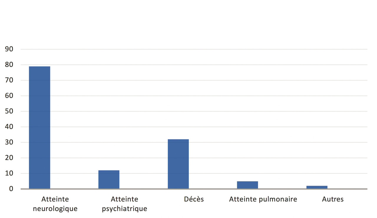 La littérature abonde en articles rapportant des troubles aigus et chroniques neurologiques et psychiatriques. Ces troubles sont liés à un déficit en vitamine B12 induit par le protoxyde d’azote.7-13 Les troubles pulmonaires, plus rares, sont liés à la toxicité du gaz. Certains patients ayant plusieurs atteintes en même temps (