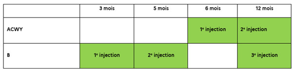 - une dose de vaccin ACWY (Nimenrix) à l’âge de 6 mois suivie d'une dose à l’âge de 12 mois (Nimenrix ou Menquadfi) ;