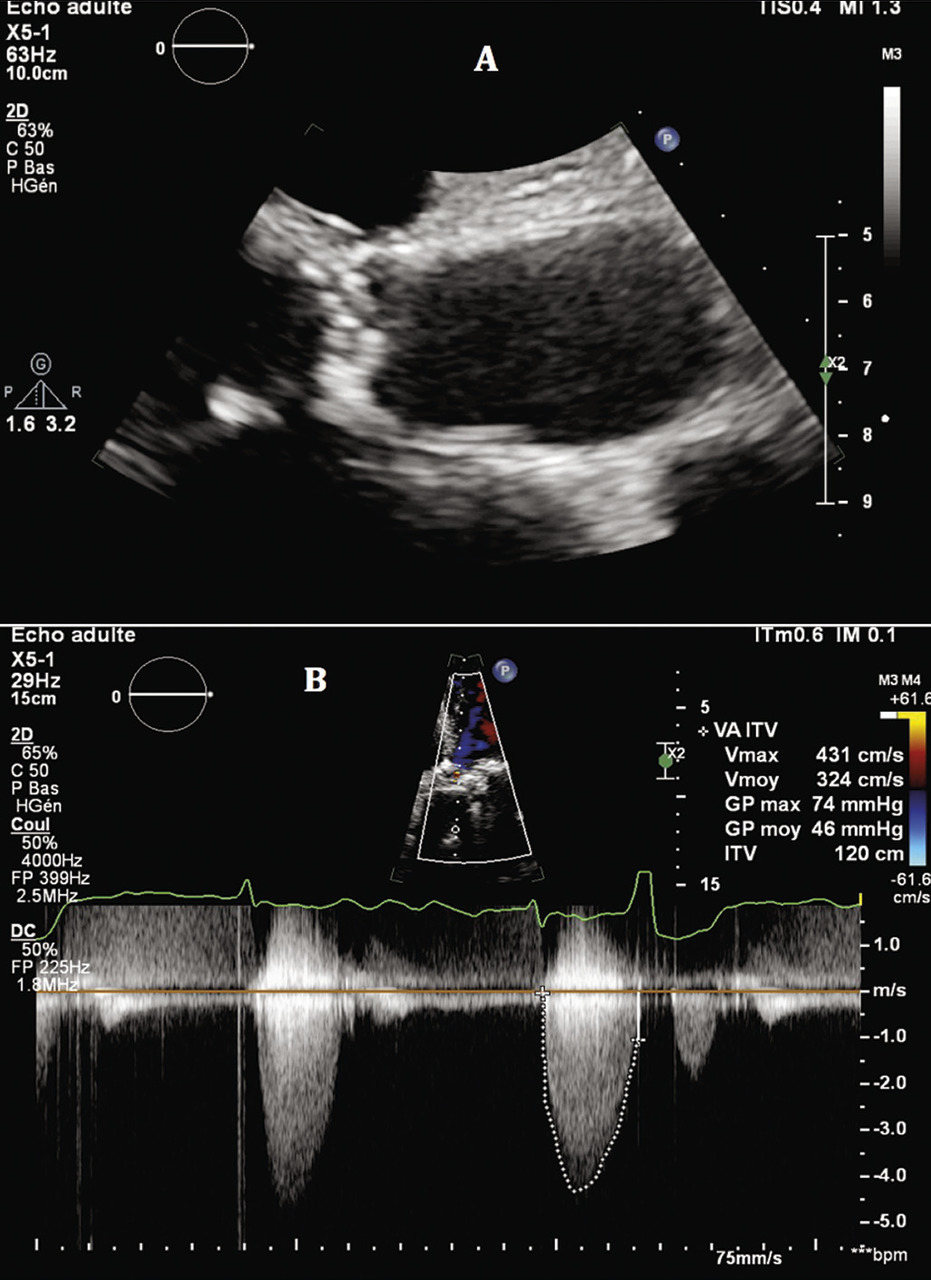 - ou surface valvulaire aortique ≤ 0,6 cm2/m2 (ou < 1 cm2, mais la valeur indexée à la surface corporelle est préférée). Sachant qu’une surface valvulaire aortique normale est de l’ordre de 2 à 3 cm2.