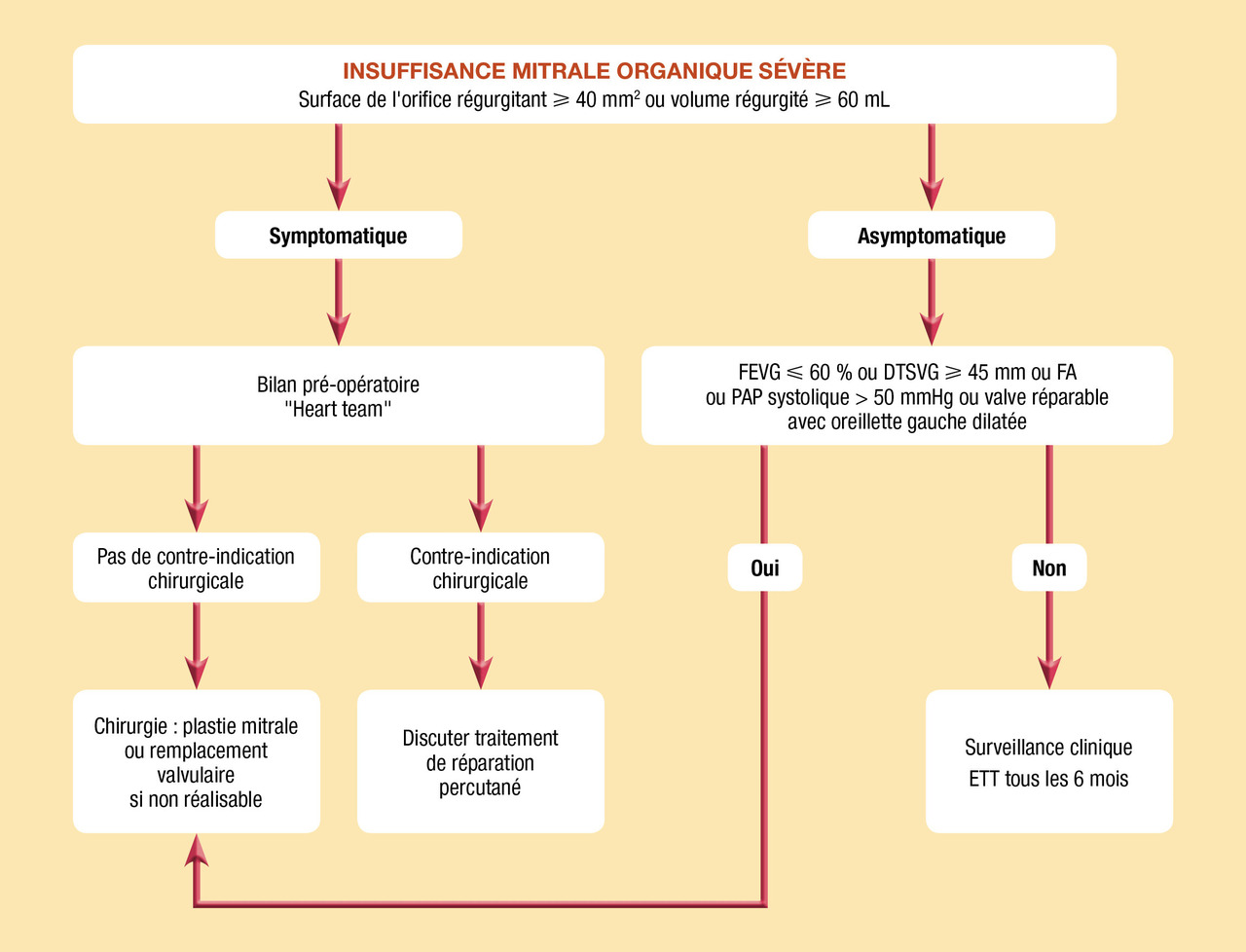 . valve réparable associée à un faible risque opératoire si dilatation de l'oreillette gauche (≥ 60 mL/m2). Pour certains dans ce cas, la dilatation de l'oreillette gauche n’est pas obligatoire ;