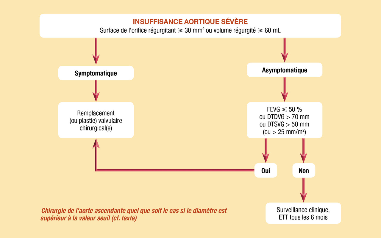 Indication chirurgicale si insuffisance aortique sévère symptomatique ou insuffisance aortique sévère asymptomatique et retentissement ventriculaire gauche ou dilatation importante de l’aorte ascendante.