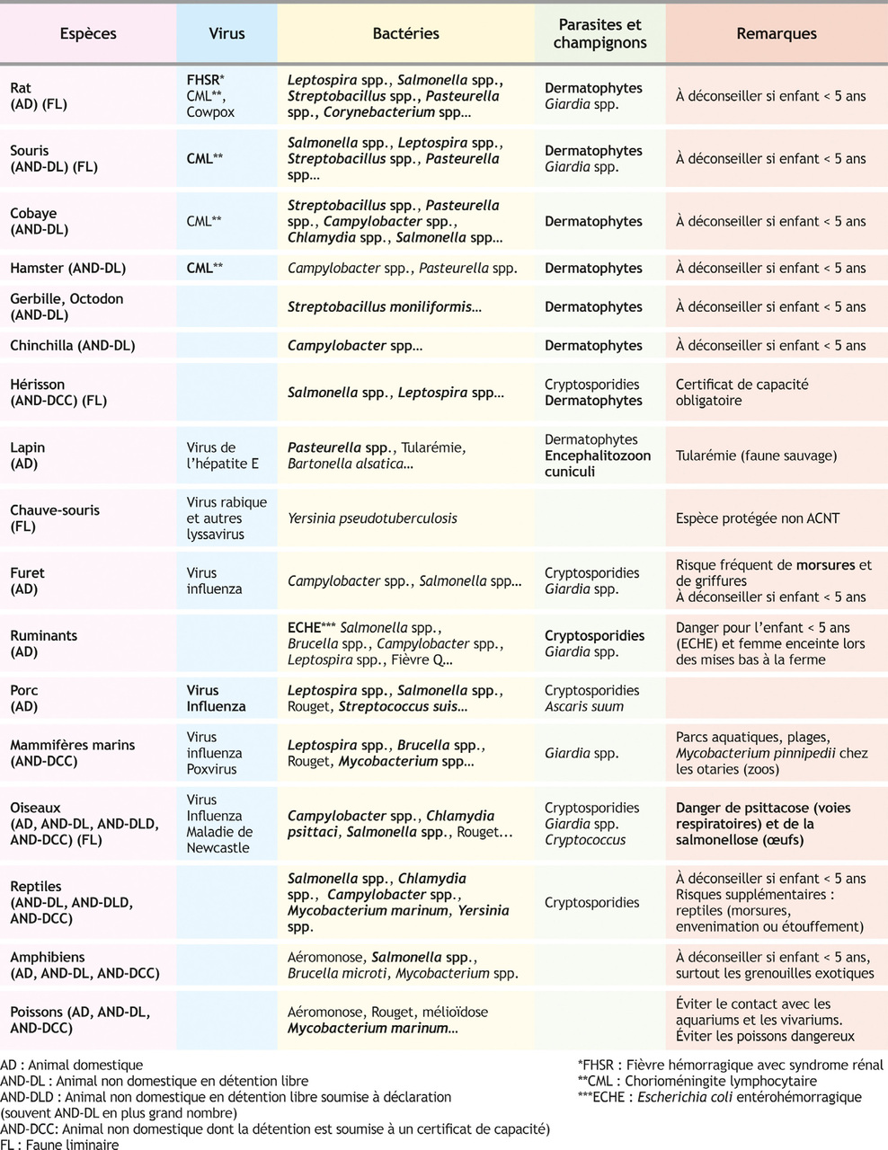 Le tableau ci-contre résume les principales zoonoses pouvant être transmises aux enfants par contact avec un ACNT au domicile ou dans un lieu public en France.