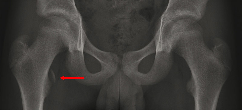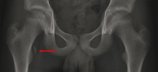 Avulsion de l'insertion du muscle psoas. Voir : P. Journeau, E. Polirzstok, F. Launay, D. Barbier. Lésions osseuses de sollicitation excessive chez l’enfant sportif. Rev Prat 2015;65(8);1084-90.