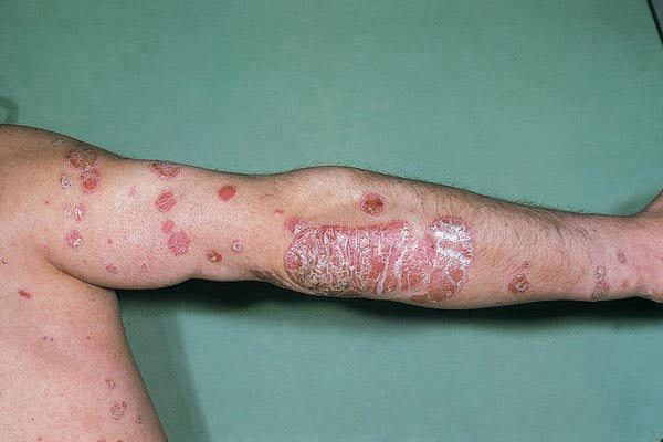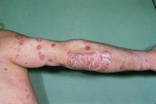 Forme typique de psoriasis. Plaque érythémato-squameuse du coude caractéristique du psoriasis en plaques vulgaire, coexistant avec des lésions de psoriasis nummulaire sur la face postérieure du bras et de l’avant-bras. La lésion élémentaire est une plaque érythématosquameuse arrondie de 1 à 3 cm de diamètre, un peu surélevée, à bordures nettes. Les squames sont épaisses, sèches, de couleur blanchâtre. Le grattage à la curette d’une squame la détache en bloc, laissant apparaître de petites gouttelettes sanglantes (signe de la rosée sanglante ou phénomène d’Auspitz).