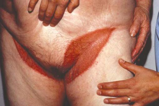 Intertrigo très bien limité, rouge sombre, sec, au niveau des plis inguinaux, inguinaux cruraux et fessier. Les lésions ne sont pas prurigineuses. Elles sont indolores, sauf quand apparaît une fissure de la partie haute du pli fessier. Les lésions, par leur nette limitation, leur aspect rouge brun, sec mais non squameux, sans prurit sont tout à fait caractéristiques du psoriasis des plis, dit psoriasis « inversé » car, habituellement, le psoriasis siège plutôt sur les reliefs, coudes, genoux, face d’extension des membres, cuir chevelu. Les patients qui en sont atteints ont souvent toutes les lésions au niveau des plis. La localisation à l’ombilic et à la partie haute du pli fessier est particulièrement évocatrice.